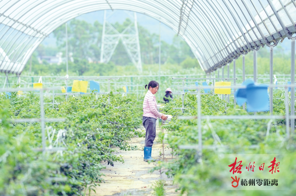 5月22日,在蒙山縣西河鎮廣育村藍莓基地內,工作人員正在采摘藍莓。梧州日報記者 楊揚 攝