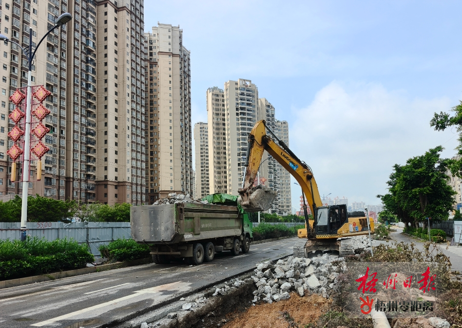 當天,記者來到龍圩區第二實驗中學對出的施工場地,看到右幅路面已進行圍蔽,沿線的機非分隔帶全部拆除,路面被挖開,打樁機和挖土機正開展作業。據介紹,蒼梧大道—城南大道正在開展溝槽開挖,為下一步的排水渠埋設做前期準備。
