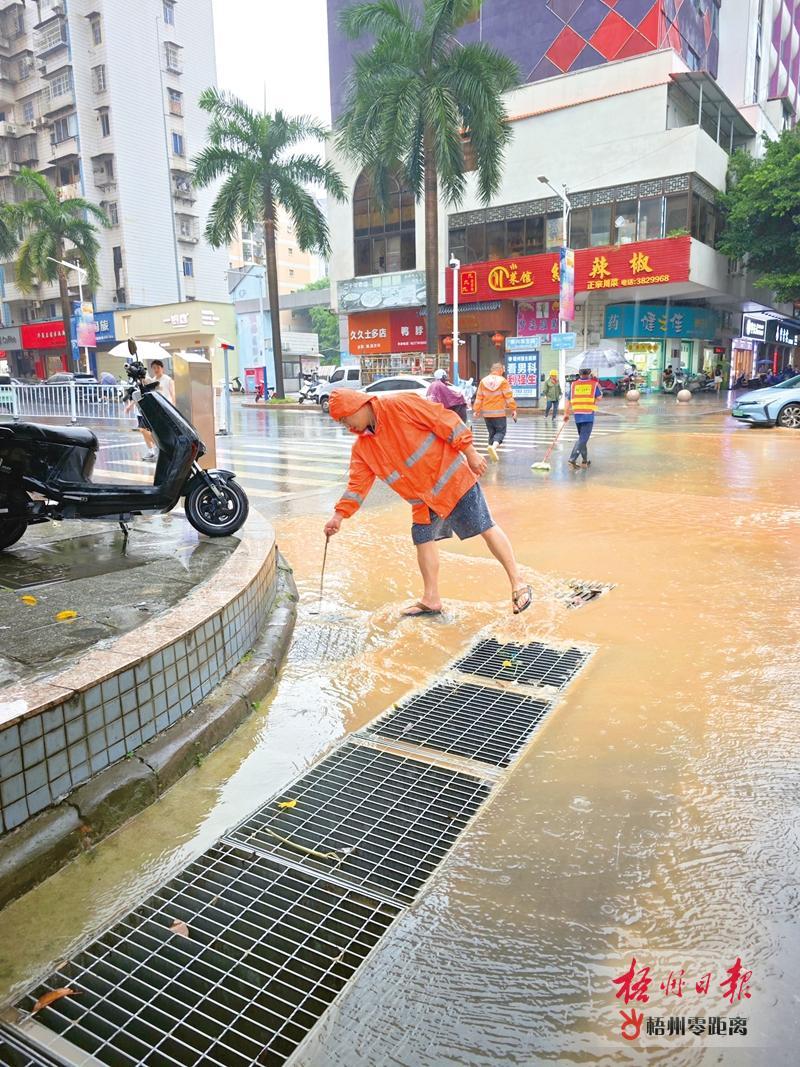 8月4日下午,市政部門工作人員在新興二路夢(mèng)之島商場(chǎng)附近疏通下水口,確保積水路段排水通暢。梧州日?qǐng)?bào)記者 何鎏 攝