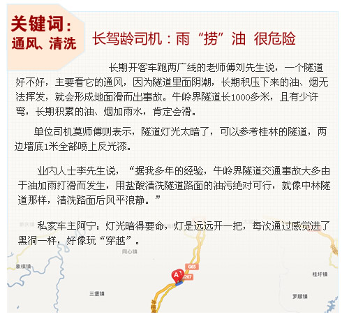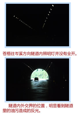4月26日,天氣晴朗,記者驅(qū)車前往岑溪牛嶺界隧道調(diào)查,試圖步行走過牛嶺界隧道遭到高速公路管理人員拒絕,只能坐車以安全速度通過隧道,無法下車核實(shí)受訪司機(jī)提供的全部情況。