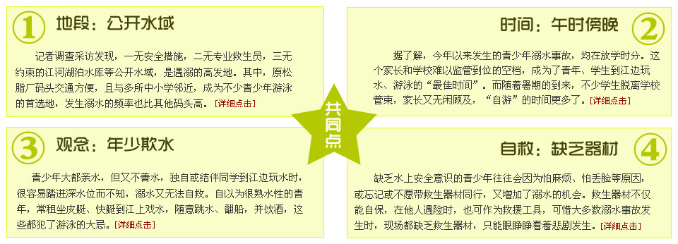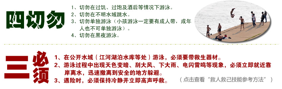 ????如今每年夏天,各中小學校除了開展各項活動言傳身教,還有老師親自到江邊查看,多方防范。在學校和家庭的“高度警示”下,大部分中小學生都能流利背出關于游泳安全的“六不準”。【詳細點擊】